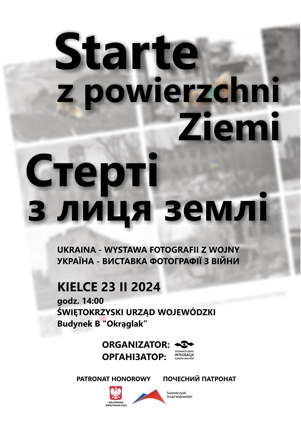 Stowarzyszenie Integracja Europa – Wschód serdecznie zaprasza na wystawę fotograficzną pn. „Starte z powierzchni Ziemi” upamiętniającą II rocznicę wybuchu pełnoskalowej wojny w Ukrainie.