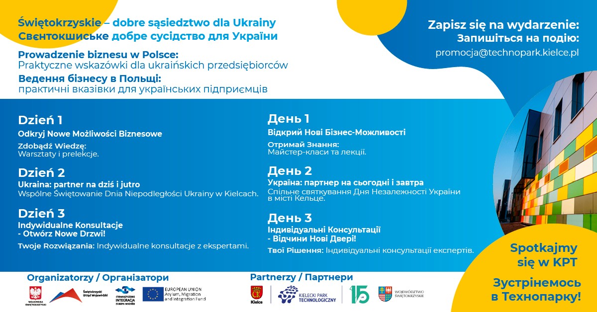 W odpowiedzi na tę potrzebę Stowarzyszenie Integracja Europa – Wschód wraz z Kieleckim Parkiem Technologicznym zorganizowali w dn. 23-25 sierpnia 2023 r. seminarium pn. „Prowadzenie biznesu w Polsce: Praktyczne wskazówki dla ukraińskich przedsiębiorców”.